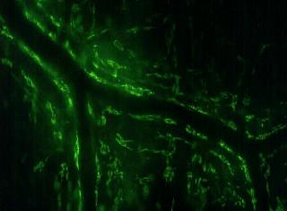 La circulation sanguine est révélée dans des veinules de boeuf, par greffage de molécules de FITC (Fluoresceine IsoThioCyanate) fluorescentes sur un sérum albumine bovin. |