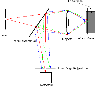 C'est une microscopie de fluorescence, qui utilise la différence de focales images pour des rayons de longueur d'onde différente comme information de profondeur dans l'objet. |