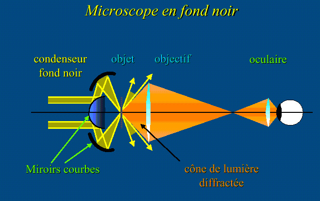 Seuls les faisceaux diffractés et réfléchis par l'échantillon traversent l'objectif du microscope. Le fond n'apparaît pas, ce qui augmente le contraste. |