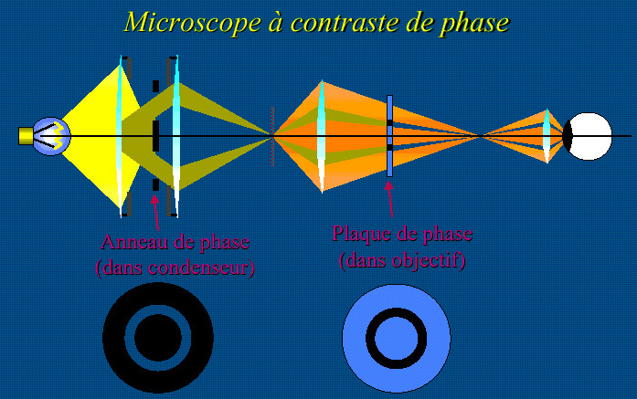 La phase de l'onde incidente est sélectionnée par un diaphragme dans au niveau du condenseur. Le faiseau déphasé par l'échantillon est grandit par le microscope, à l'intérieur duquel un autre diaphragme vient sélectionner les ondes de même phase que celles après condenseur (contraste clair) ou toutes les autres (contraste sombre). On peut aussi ajouter un système interferrométrique qui permet de reconstituer le contraste de phase induit par l'objet (contraste d'interférences) |