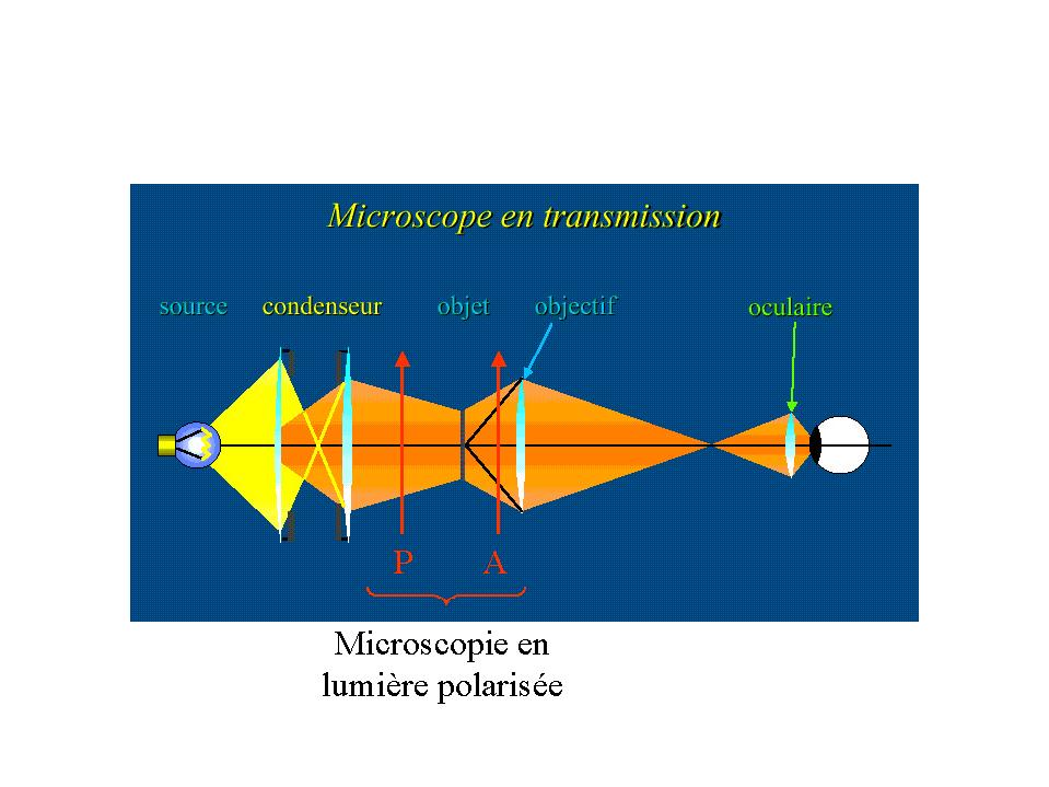 Un microscope en transmission comporte également un condenseur (généralement deux lentilles plan-convexes accolées) qui augmente le flux lumineux traversant l'échantillon observé. Si léchantillon est placé entre analyseur et polariseur, on peut révéler les variations locales d'indice optique dans l'échantillon, donc les variations d'orientation, les gradients d'indices ... |