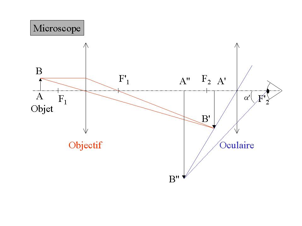 Un microscope est constitué d'une part d'un objectif formant une image A'B' d'un objet AB entre un objectif et son plan focal objet. D'autre part d'un oculaire utilisé comme loupe, faisant une image virtuelle A''B'' de A'B'. Si l'image A'B' est formé sur le plan focal objet de l'oculaire, le microscope est dit"afocal", et il produit une image de trè fort grandissement à l'infini, donc sans accomodation nécessaire de l'oeil observateur. |