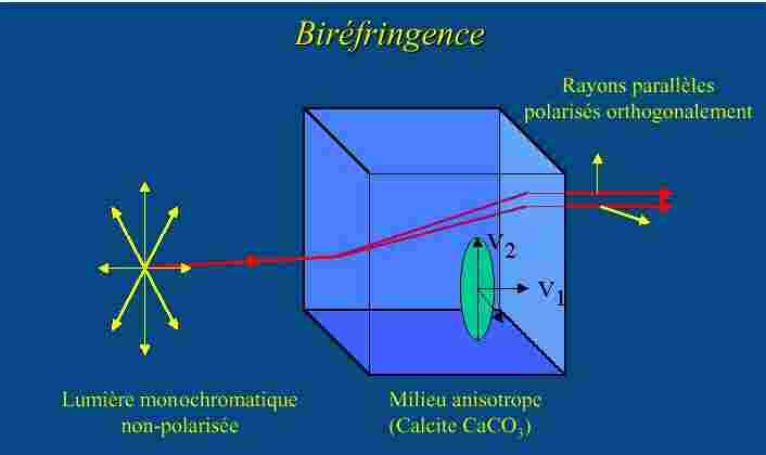 Selon le matèriau, la vitesse de propagation lumineuse dépend de sa direction. Par exemple, pour un monocristal de calcite, il existe deux vitesses de propagation, l'une rapide selon l'axe c de la structure cristalline, l'autre lente dans les plans (a,b). On a alors une ellipsoide d'indices de réfraction. Des cristaux bi-refringents peuvent servir à fabriquer des polariseurs utilisés en microscopie en lumière polarisée par exemple. |