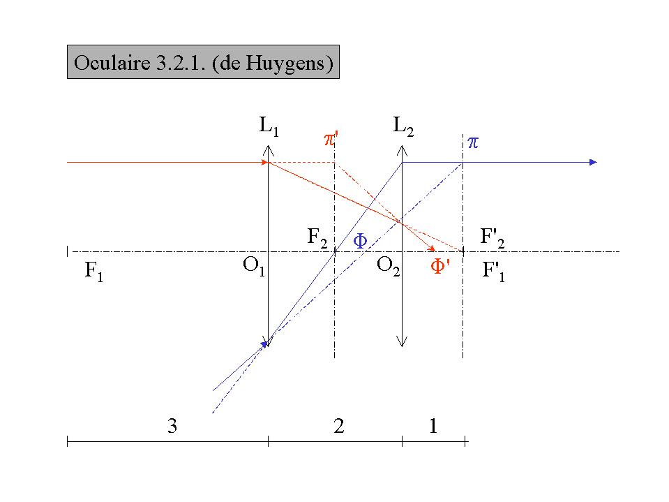 L'oculaire d'un microscope peut être constitué de plusieurs lentilles pour obtenir de plus forts grossissements. Par exemple, l'oculaire de Huygens est constitué de deux lentilles de focales 3 et 1 (en unité de distance focale), placée l'une de l'autre à 2. On appelle cet oculaire un oculaire 3.2.1. A l'aide des formules de Newton on peut retrouver les foyers principaux F et F' de cet oculaire, puis ses plans principaux p et p'. |