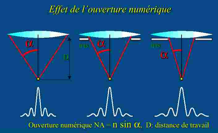 La largeur de la tache de Airy dépend de l'ouverture numérique a . Donc la résolution également, plus a est faible, plus la résolution diminue. |