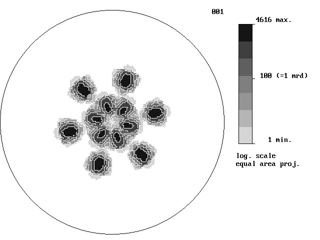 Theoretical {001} pole figures calculated with STPF, for 12 different orientations described with Gauss components (width at half maximum is 5 degrees). The Euler angles in Roe/Matthies convention are (48,12,0), (108,12,0), (168,12,0), (228,12,0), (288,12,0), (348,12,0), (12,30,40), (72,30,40), (132,30,40), (192,30,40), (252,30,40) and (312,30,40). Tetragonal crystal structure (a=4.369A, c=12.44A) and triclinic sample symmetry.