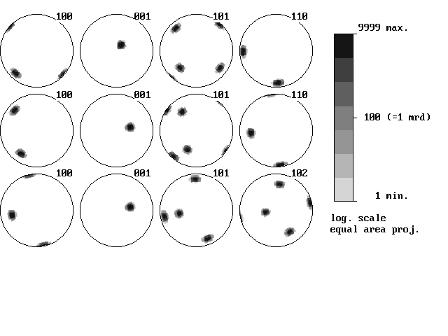 Theoretical {001}, {101}, {102}, and {110} pole figures calculated with STPF, described with Gauss components (width at half maximum is 5 degrees). The Euler angles in Roe/Matthies convention are (48,12,0) for the top row, (12,30,0) for middle row and (12,30,40) for bottom row. Tetragonal crystal structure (a=4.369A, c=12.44A) and triclinic sample symmetry.