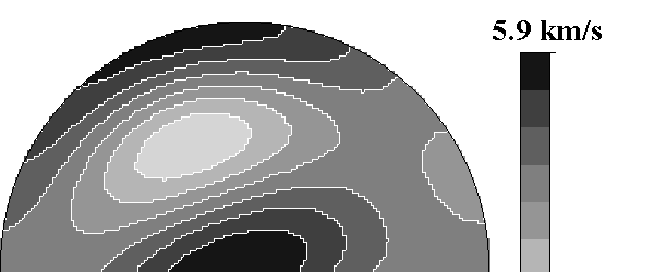 p wave velocity surface of a Ni-30%Co polycrystal alloy having the texture described by the OD of first example in POXX examples. The texture shows [111] axes perpendicular to the projection plane. Main axes of the sample are aligned parallel to the main axes of the projection.