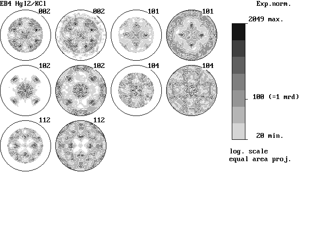 Experimental-normalized and recalculated pole figures after refinement of the orientation distribution with WIMV. The texture is very strong, relevant of several heteroepitaxial relationships. Note the very good agreement between experimental and recalculated pole figures (in a successive order). The maximal OD in this sample is 240 m.r.d., minima is 0, texture index is 40 m.r.d.2